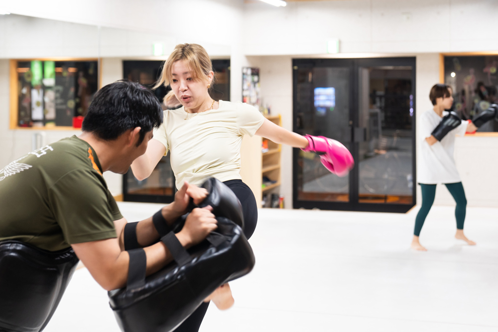 ミット打ちで思い切り汗をかくと、日常のストレスもスッキリ吹き飛びます。上手く蹴れたときの爽快感が気持ちよくて、気づけば夢中になっています。