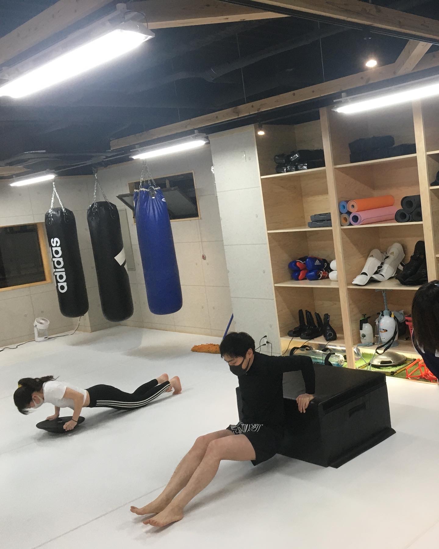 各予約時間10分前の除菌剤による、床、サンドバッグ、備品の消毒