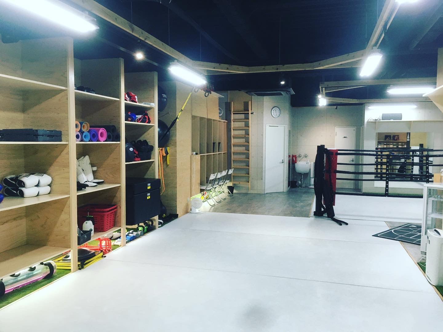 各予約時間10分前の除菌剤による、床、サンドバッグ、備品の消毒